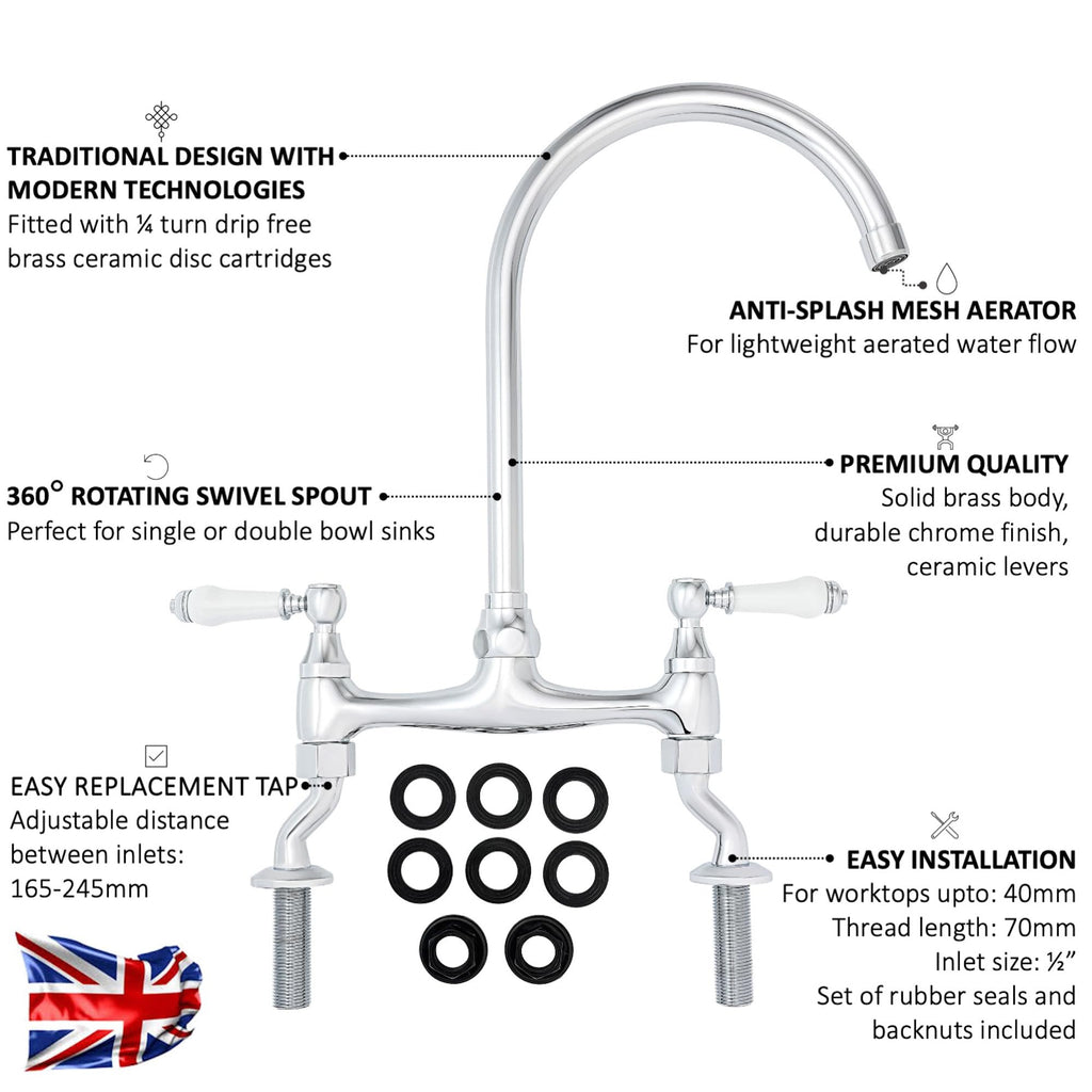 • WHAT'S IN THE BOX- The Astbury traditional bridge kitchen mixer tap with white ceramic levers comes complete with fitting backnuts, mixer tap and installation guide. Height approximately: 442mm, Spout projection approximately: 225mm, Suitable for worktops/sinks up to 40mm thickness. Adjustable tap pillars allow for taps to be installed on a sink or worktop with tap hole distance of between 165 and 245mm.